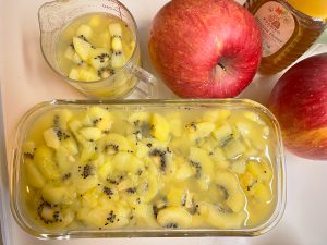 一見カサカサでも意外と水分はあるんだなと翌々日さらに1ヶ月後濾して冷蔵保存金柑は種を抜き軽く砂糖で煮てから保存収穫時点で軟らかかったキウイは速攻ゼリー寄せに(※りんごは写り込んだだけ)今年の花梨は落果が多いので期待半分でカットしたけど思ったほど傷んではいなかった