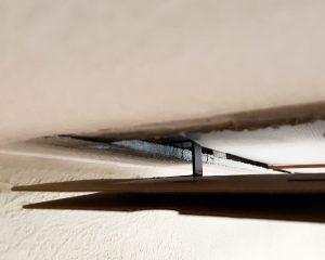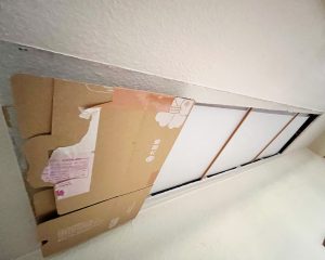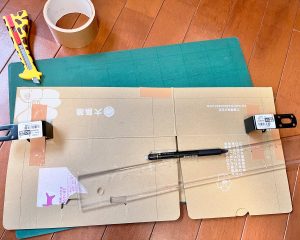 モノタロウに注文したJ型金具が届いたから段ボールを使って取り付け位置を検討。石膏ボードと柱の位置をしっかり測って勘案して